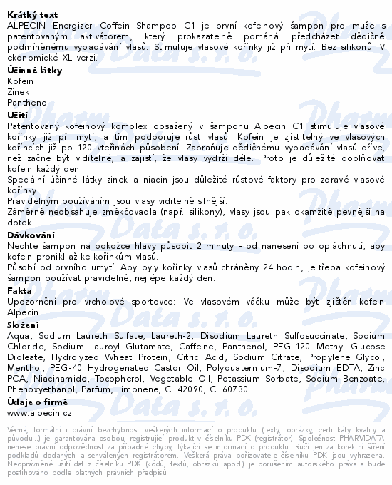 ALPECIN Energizer Coffein Shampoo C1 je první kofeinový šampon pro muže s patentovaným aktivátorem, který prokazatelně pomáhá předcházet dědičně podmíněnému vypadávání vlasů. Stimuluje vlasové kořínky již při mytí. Bez silikonů. V ekonomické XL verzi.