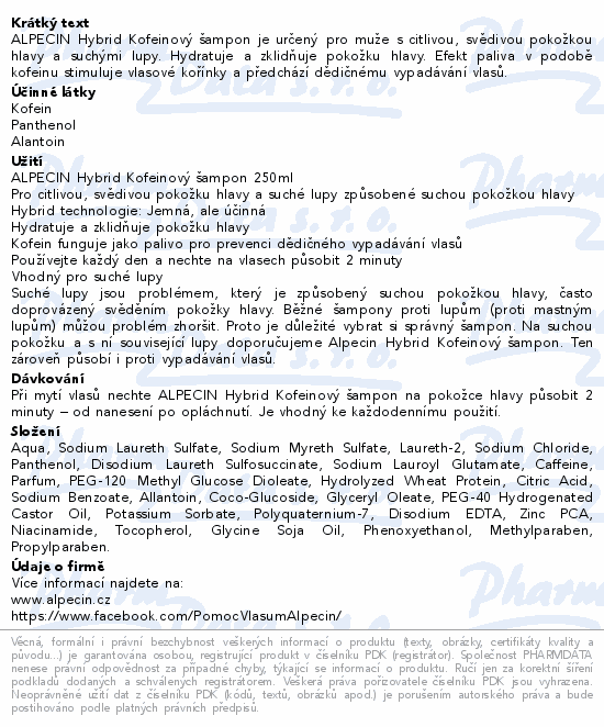 ALPECIN Hybrid Kofeinový šampon je určený pro muže s citlivou, svědivou pokožkou hlavy a suchými lupy. Hydratuje a zklidňuje pokožku hlavy. Efekt paliva v podobě kofeinu stimuluje vlasové kořínky a předchází dědičnému vypadávání vlasů.