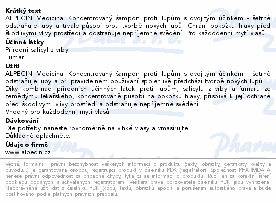 ALPECIN Medicinal Koncentrovaný šampon proti lupům s dvojitým účinkem - šetrně odstraňuje lupy a trvale působí proti tvorbě nových lupů. Chrání pokožku hlavy před škodlivými vlivy prostředí a odstraňuje nepříjemné svědění. Pro každodenní mytí vlasů.