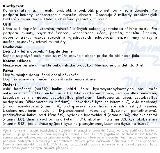 Komplex vitaminů, minerálů, probiotik a prebiotik pro děti od 7 let a dospělé. Pro podporu imunity, koncentrace a mentální činnosti. Obsahuje 2 miliardy probiotických bakterií v denní dávce. Dále je obsaženo prebiotikum inulin.