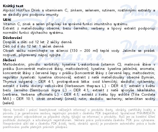 Alpikol HotFlux Drink s vitaminem C, zinkem, selenem, rutinem, rostlinnými extrakty a se sladidly pro podporu imunity.