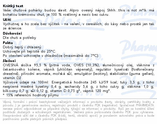 Vaše chuťové pohárky budou slavit. Alpro ovesný nápoj Shhh...this is not m*lk má bohatou krémovou chuť, je 100 % rostlinný a navíc bez cukru.