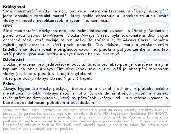 Silné menstruační vložky na noc, pro velmi intenzivní krvácení, s křidélky. Absorpční jádro obsahuje speciální materiál, který rychle absorbuje a uzamkne tekutinu uvnitř vložky v množství několikanásobně vyšším než sám váží.