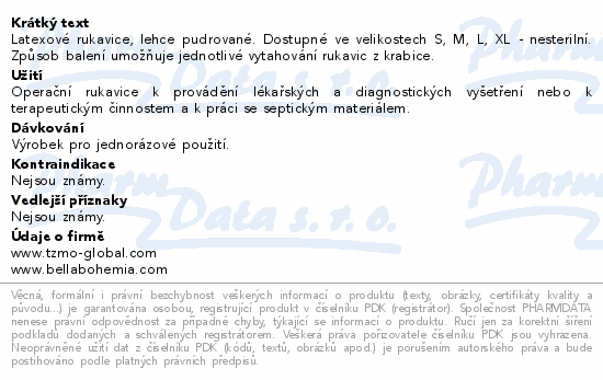 Latexové rukavice, lehce pudrované. Dostupné ve velikostech S, M, L, XL - nesterilní. Způsob balení umožňuje jednotlivé vytahování rukavic z krabice.