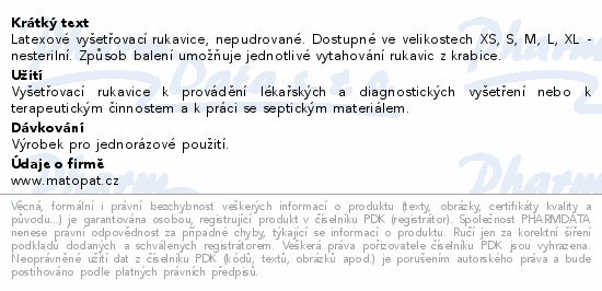 Latexové vyšetřovací rukavice, nepudrované. Dostupné ve velikostech XS, S, M, L, XL - nesterilní. Způsob balení umožňuje jednotlivé vytahování rukavic z krabice.