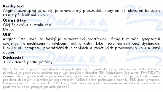 Anginal ústní sprej se šalvějí je zdravotnický prostředek, který přináší úlevu při bolesti v krku a při škrábání v krku.