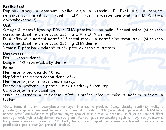 Doplněk stravy s obsahem rybího oleje a vitaminu E. Rybí olej je zdrojem nenasycených mastných kyselin EPA (kys. eikosapentaenová) a DHA (kys. dokosahexaenová).