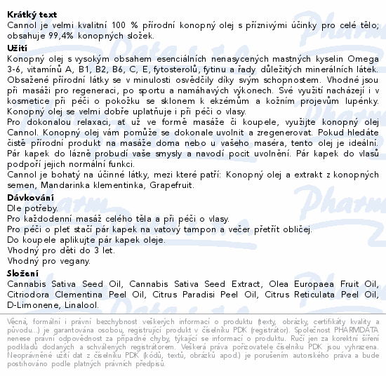 Cannol je velmi kvalitní 100 % přírodní konopný olej s příznivými účinky pro celé tělo; obsahuje 99,4% konopných složek.