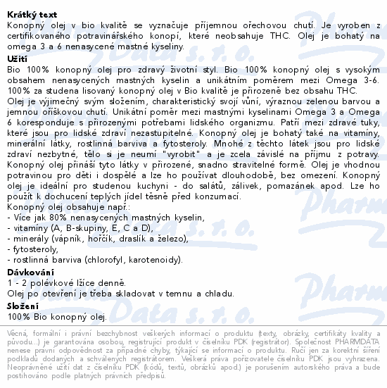 Konopný olej v bio kvalitě se vyznačuje příjemnou ořechovou chutí. Je vyroben z certifikovaného potravinářského konopí, které neobsahuje THC. Olej je bohatý na omega 3 a 6 nenasycené mastné kyseliny.