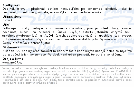 Doplněk stravy - předchází obtížím nastupujícím po konzumaci alkoholu, jako je nevolnost, bolest hlavy, závratě, únava.Vykazuje antioxidační účinky.