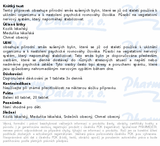 Tento přípravek obsahuje přírodní směs sušených bylin, které se již od staletí používá k uklinění organizmu a k nastolení psychické rovnováhy člověka. Působí na vegetativní nervový systém, který napomáhají stabilizovat.