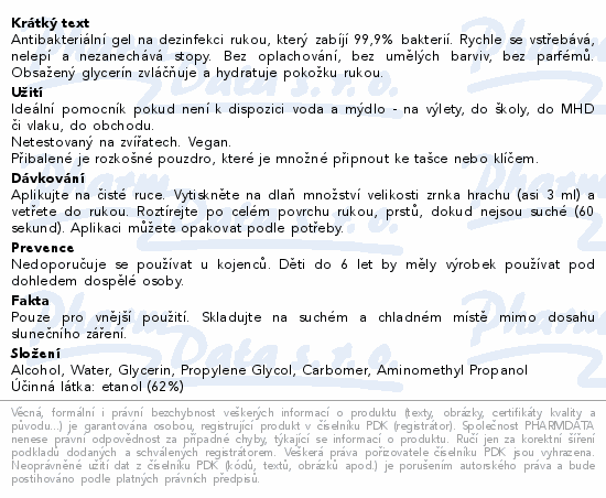 Antibakteriální gel na dezinfekci rukou, který zabíjí 99,9% bakterií. Rychle se vstřebává, nelepí a nezanechává stopy. Bez oplachování, bez umělých barviv, bez parfémů. Obsažený glycerín zvláčňuje a hydratuje pokožku rukou.