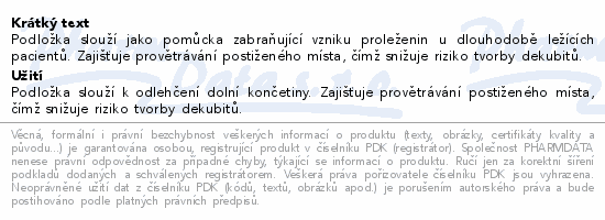 Podložka slouží jako pomůcka zabraňující vzniku proleženin u dlouhodobě ležících pacientů. Zajišťuje provětrávání postiženého místa, čímž snižuje riziko tvorby dekubitů.
