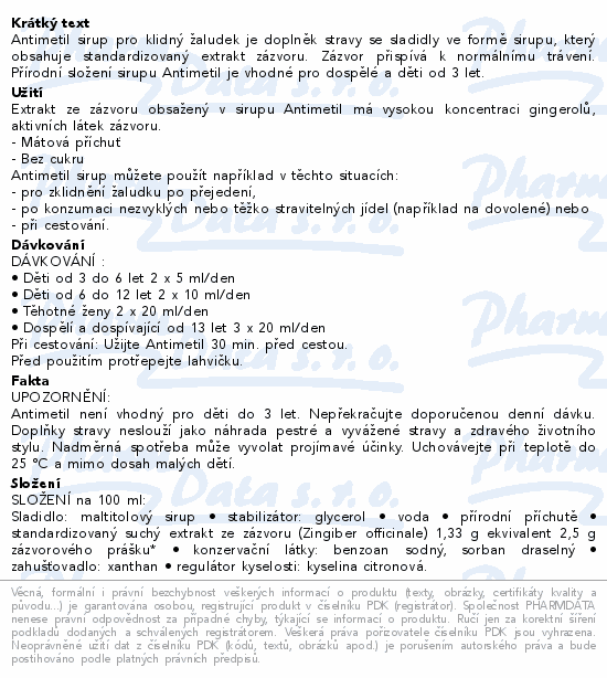 Antimetil sirup pro klidný žaludek je doplněk stravy se sladidly ve formě sirupu, který obsahuje standardizovaný extrakt zázvoru. Zázvor přispívá k normálnímu trávení. Přírodní složení sirupu Antimetil je vhodné pro dospělé a děti od 3 let.