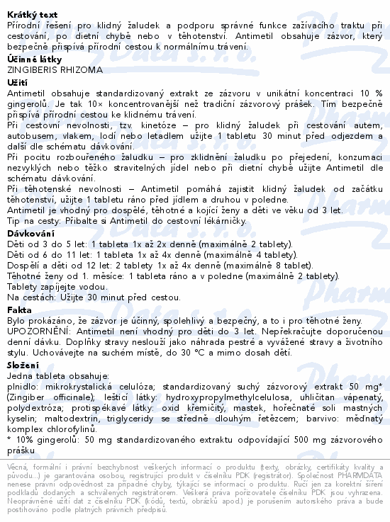Přírodní řešení pro klidný žaludek a podporu správné funkce zažívacího traktu při cestování, po dietní chybě nebo v těhotenství. Antimetil obsahuje zázvor, který bezpečně přispívá přírodní cestou k normálnímu trávení.