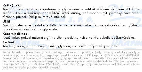 Apicold ústní sprej s propolisem a glycerinem s antibakteriálním účinkem zklidňuje zánět v krku a zmírňuje podráždění ústní dutiny, což mohou být příznaky nachlazení různého původu (chřipka, virové infekce).