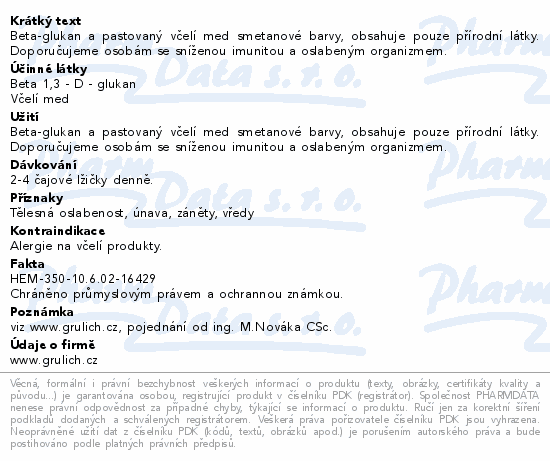 Beta-glukan a pastovaný včelí med smetanové barvy, obsahuje pouze přírodní látky. Doporučujeme osobám se sníženou imunitou a oslabeným organizmem.