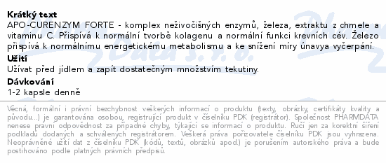 APO-CURENZYM FORTE - komplex neživočišných enzymů, železa, extraktu z chmele a vitaminu C. Přispívá k normální tvorbě kolagenu a normální funkci krevních cév. Železo přispívá k normálnímu energetickému metabolismu a ke snížení míry únavya vyčerpání.
