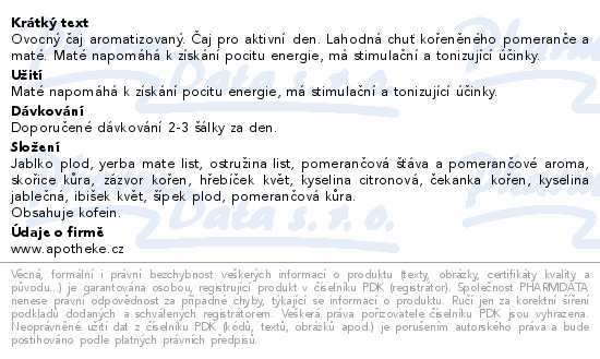 Ovocný čaj aromatizovaný. Čaj pro aktivní den. Lahodná chuť kořeněného pomeranče a maté. Maté napomáhá k získání pocitu energie, má stimulační a tonizující účinky.