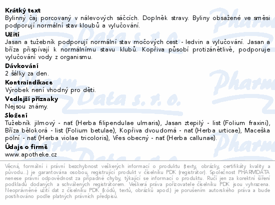 Bylinný čaj porcovaný v nálevových sáčcích. Doplněk stravy. Byliny obsažené ve směsi podporují normální stav kloubů a vylučování.