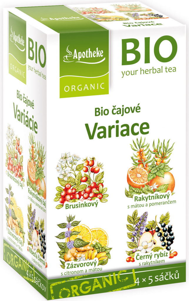 BIO Čajové variace zahrnují 4 druhy ovocných čajů. (Zázvorový čaj s citronem a mátou; Rakytníkový čaj s mátou a pomerančem; Brusinkový ovocný čaj; Černý rybíz s rakytníkem).
