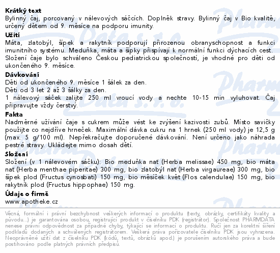 Bylinný čaj, porcovaný v nálevových sáčcích. Doplněk stravy. Bylinný čaj v Bio kvalitě, určený dětem od 9. měsíce na podporu imunity.