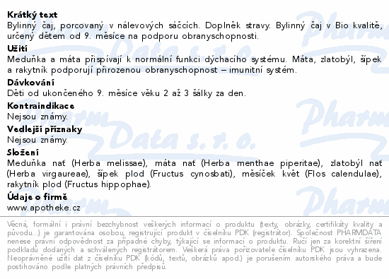 Bylinný čaj, porcovaný v nálevových sáčcích. Doplněk stravy. Bylinný čaj v Bio kvalitě, určený dětem od 9. měsíce na podporu obranyschopnosti.