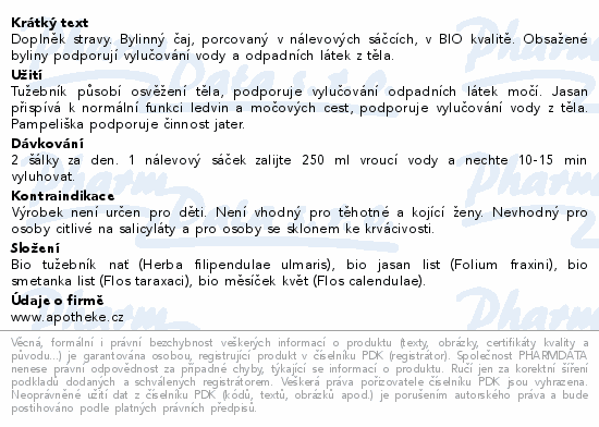 Doplněk stravy. Bylinný čaj, porcovaný v nálevových sáčcích, v BIO kvalitě. Obsažené byliny podporují vylučování vody a odpadních látek z těla.