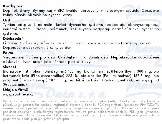 Doplněk stravy. Bylinný čaj v BIO kvalitě, porcovaný v nálevových sáčcích. Obsažené byliny působí příznivě na dýchací cesty.