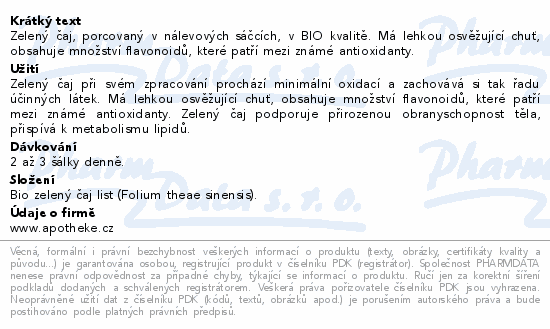 Zelený čaj, porcovaný v nálevových sáčcích, v BIO kvalitě. Má lehkou osvěžující chuť, obsahuje množství flavonoidů, které patří mezi známé antioxidanty.