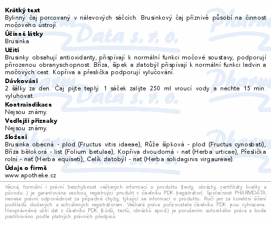 Bylinný čaj porcovaný v nálevových sáčcích. Brusinkový čaj příznivě působí na činnost močového ústrojí.