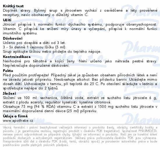 Doplněk stravy. Bylinný sirup s jitrocelem vychází z osvědčené a léty prověřené receptury, navíc obohacený o důležitý vitamin C.