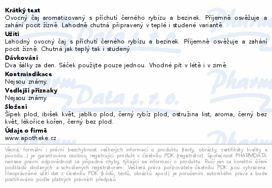 Ovocný čaj aromatizovaný s příchutí černého rybízu a bezinek. Příjemně osvěžuje a zahání pocit žízně. Lahodně chutná připravený v teplé i studené variantě.