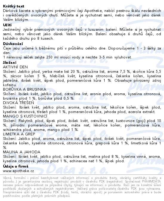 Dárková kazeta s vybranými prémiovými čaji Apotheke, nabízí pestrou škálu nevšedních i osvědčených ovocných chutí. Můžete si je vychutnat sami, nebo věnovat jako dárek Vašim blízkým.