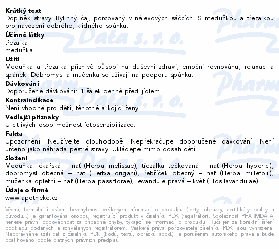 Doplněk stravy. Bylinný čaj, porcovaný v nálevových sáčcích. S meduňkou a třezalkou pro navození dobrého, klidného spánku.