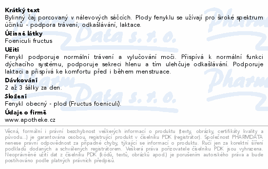 Bylinný čaj porcovaný v nálevových sáčcích. Plody fenyklu se užívají pro široké spektrum účinků - podpora trávení, odkašlávání, laktace.