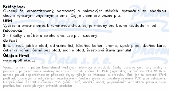 Ovocný čaj aromatizovaný, porcovaný v nálevových sáčcích. Vyznačuje se lahodnou chutí a výrazným příjemným aroma. Čaj je určen pro běžné pití.