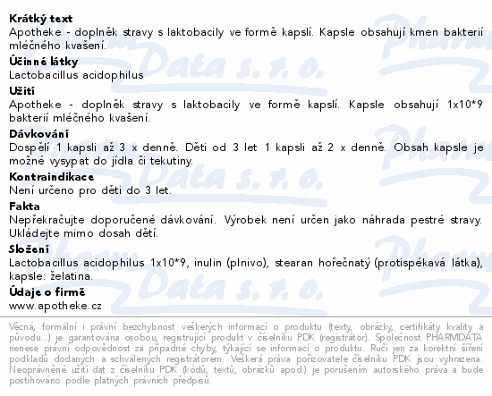 Apotheke - doplněk stravy s laktobacily ve formě kapslí. Kapsle obsahují kmen bakterií mléčného kvašení.