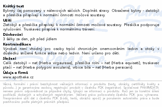 Bylinný čaj porcovaný v nálevových sáčcích. Doplněk stravy. Obsažené byliny - zlatobýl a přeslička přispívají k normální činnosti močové soustavy.