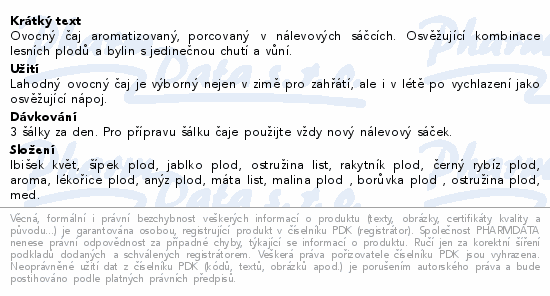 Ovocný čaj aromatizovaný, porcovaný v nálevových sáčcích. Osvěžující kombinace lesních plodů a bylin s jedinečnou chutí a vůní.