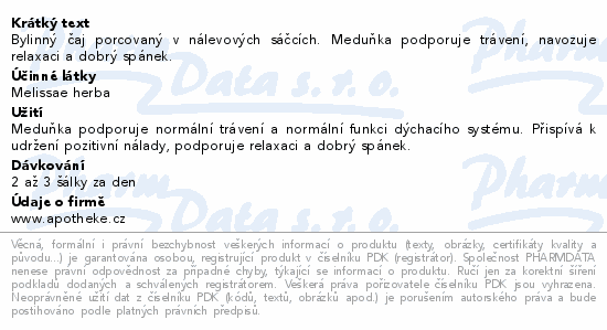 Bylinný čaj porcovaný v nálevových sáčcích. Meduňka podporuje trávení, navozuje relaxaci a dobrý spánek.