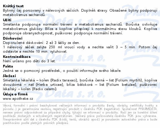 Bylinný čaj porcovaný v nálevových sáčcích. Doplněk stravy. Obsažené byliny podporují metabolismus sacharidů.