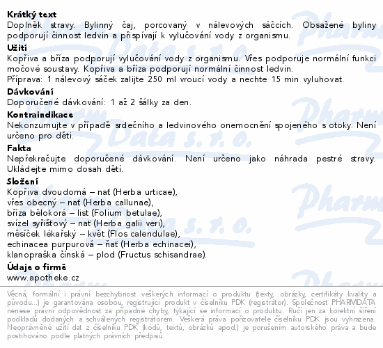 Doplněk stravy. Bylinný čaj, porcovaný v nálevových sáčcích. Obsažené byliny podporují činnost ledvin a přispívají k vylučování vody z organismu.