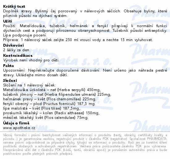 Doplněk stravy. Bylinný čaj porcovaný v nálevových sáčcích. Obsahuje byliny, které příznivě působí na dýchací systém.