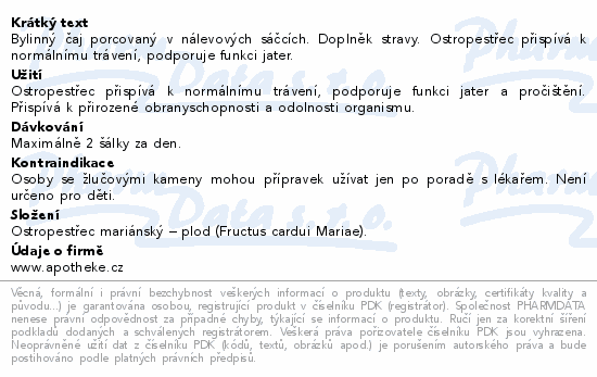 Bylinný čaj porcovaný v nálevových sáčcích. Doplněk stravy. Ostropestřec přispívá k normálnímu trávení, podporuje funkci jater.