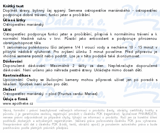 Doplněk stravy, bylinný čaj sypaný. Semena ostropestřce mariánského - ostropestřec podporuje dobré trávení, funkci jater a pročištění.