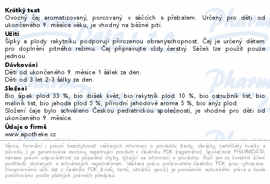 Ovocný čaj aromatizovaný, porcovaný v sáčcích s přebalem. Určený pro děti od ukončeného 9. měsíce věku, je vhodný na běžné pití.