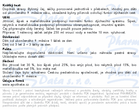 Doplněk stravy. Bylinný čaj, sáčky porcované jednotlivě v přebalech, vhodný pro děti od ukončeného 9. měsíce věku, obsažené byliny příznivě ovlivňují funkci dýchacích cest.