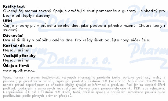 Ovocný čaj aromatizovaný. Spojuje osvěžující chuť pomeranče a guarany. Je vhodný pro běžné pití teplý i studený.