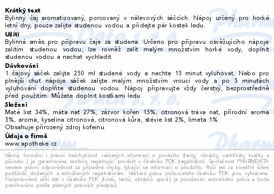 Bylinný čaj aromatizovaný, porcovaný v nálevových sáčcích. Nápoj určený pro horké letní dny, pouze zalijte studenou vodou a přidejte pár kostek ledu.